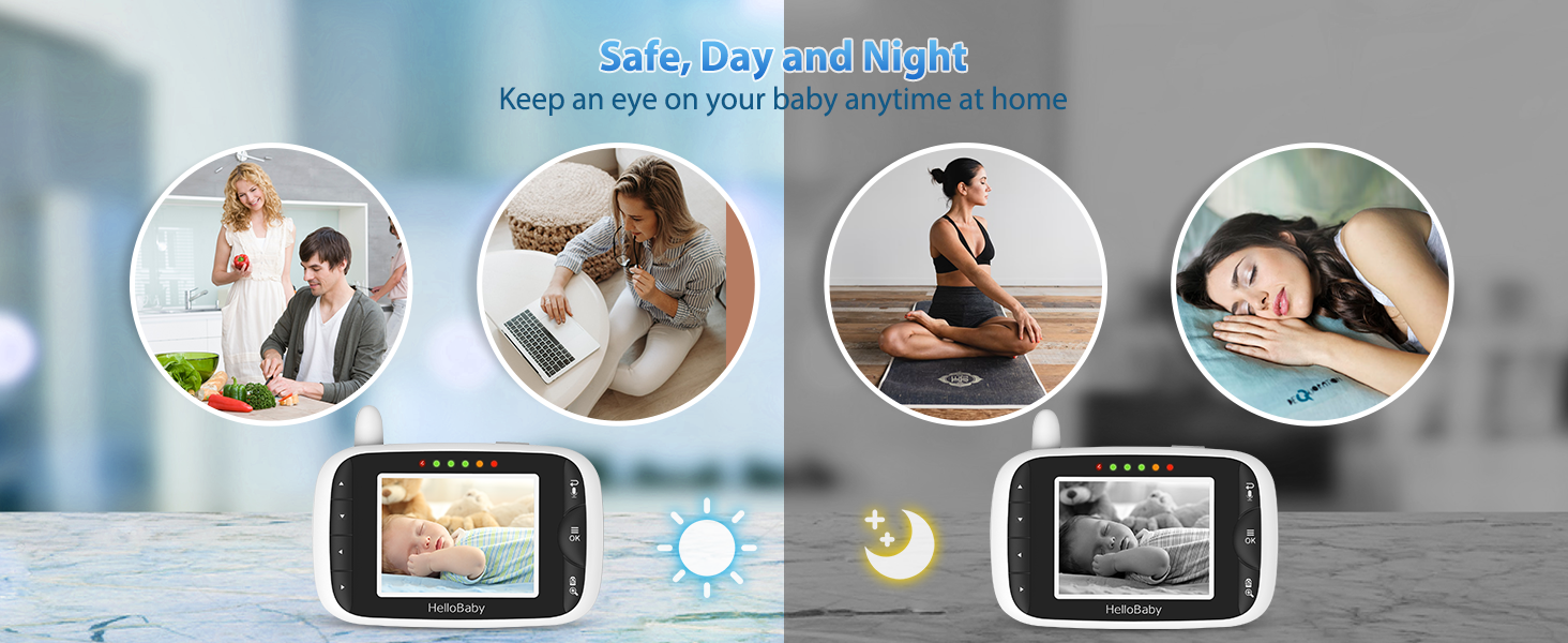 Automatic night vision mode with clear greyscale infrared images lets you effortlessly check your baby's live situation as you stay in bed at dark night, there is nothing stopping you from doting on your child all day and night with our video monitor.