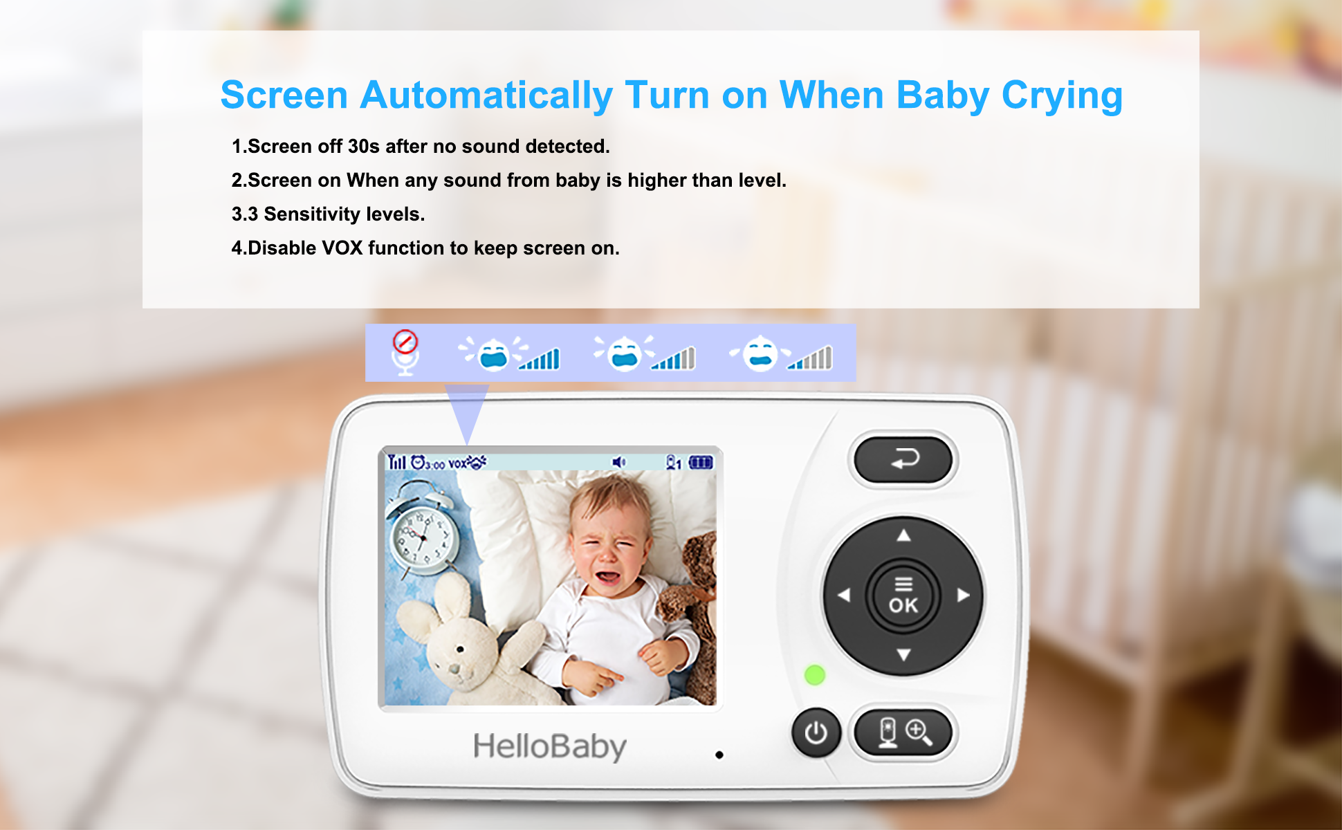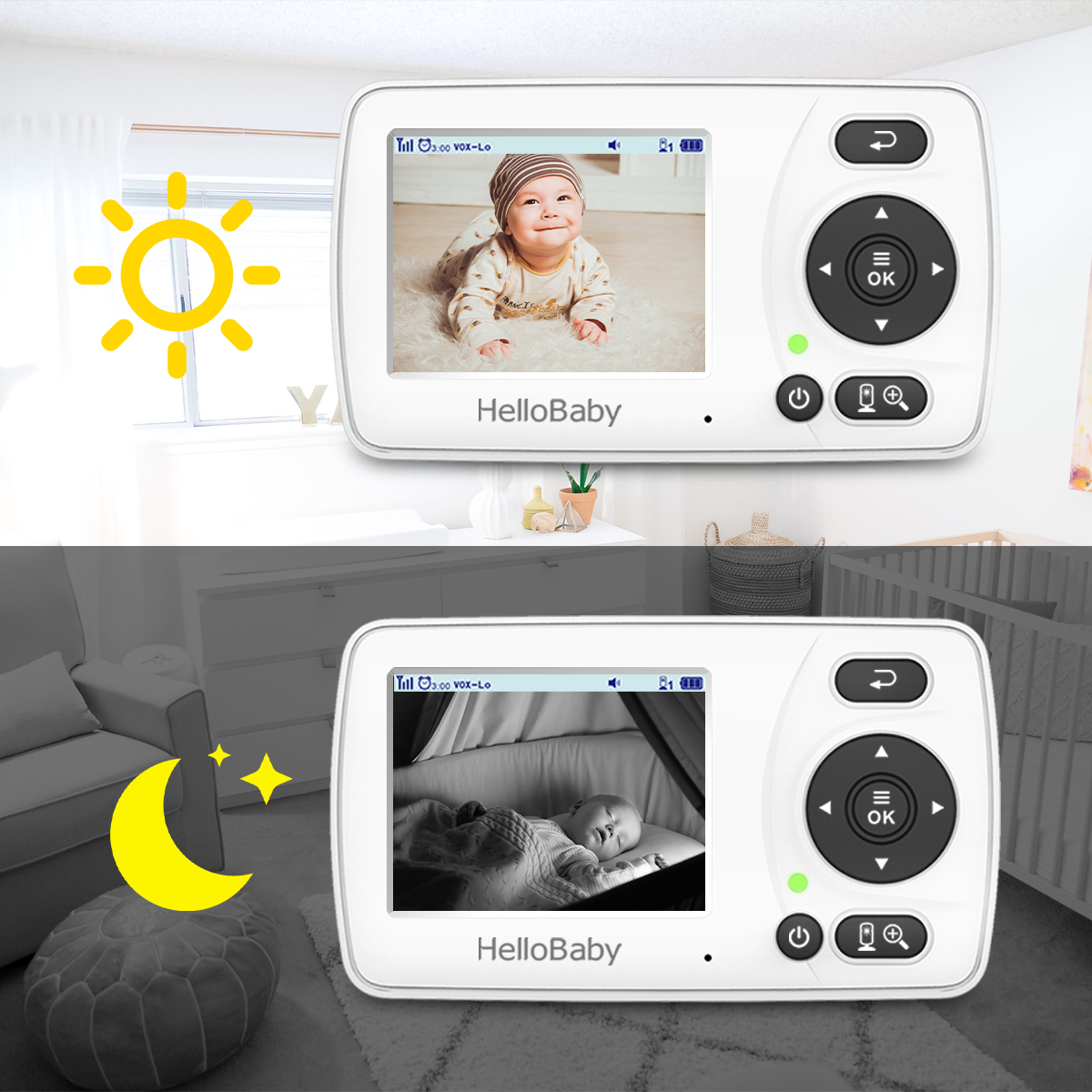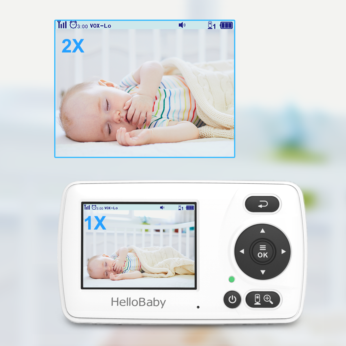 HelloBaby baby monitor with camera and audio is equipped with color LCD display which is digital zoom 2X for more details to check baby's sleeping condition falling into sleep or playing, even the facial expressions.