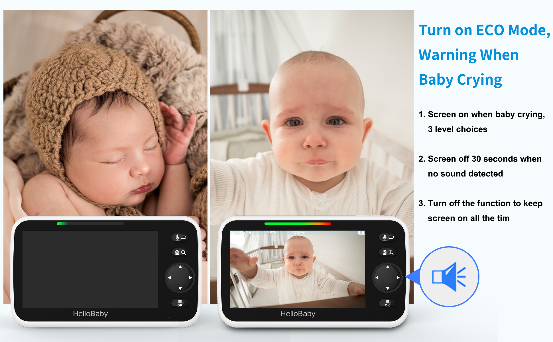 - Alarm & Peace of Mind: The screen turns off for quiet and power saving, automatically waking up when sound is detected. The 3-level sound indicator alerts you visually when your baby cries.