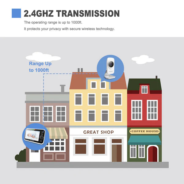 100% secure with a 2.4GHz frequency and stable connection the operating range could be up to 900ft (tested in open air)—everything is seen and heard in real-time.